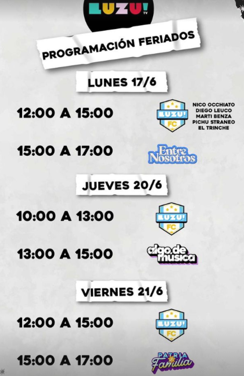 En tanto, el jueves 20 Luzu FC estará de 10 a 13, mientras que de 13 a 15 el programa que saldrá al aire será 'Algo de Música'. En este marco, el viernes feriado tendrá la presencia de Nico Occhiato, Marti Benza, Trinche, Pichu y Diego Leuco con Luzu FC de 12 a 15, mientras que de 15 a 17 tomará las riendas del canal 'Patria y Familia'.