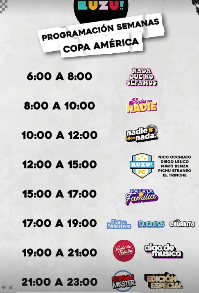 Dejando a un lado los feriados, Luzu ya confirmó oficialmente cómo será su programación estas semanas de Copa América. La noticia destacada es el uso de un nuevo horario para el canal: de 6 a 8, donde Chino Leunis y su equipo harán 'Nada Que No Sepamos'.