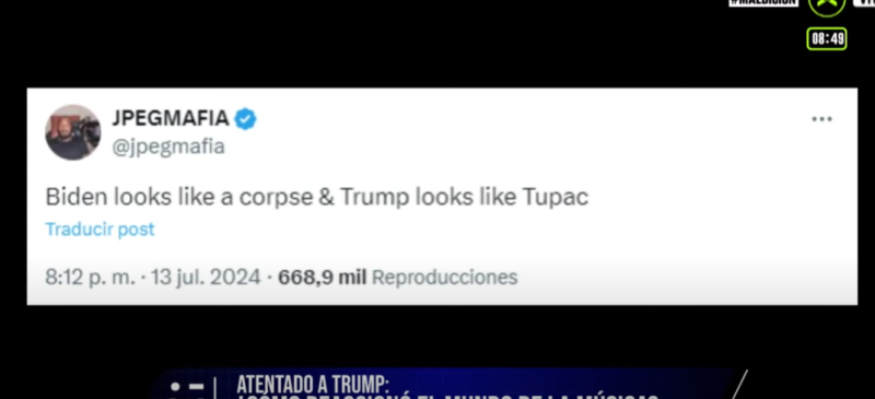 "El siguiente es el rapero estadounidense JPEGMAFIA quien escribió Biden parece un cadáver y Trump parece Tupac". Todos se rieron con ese tuit.