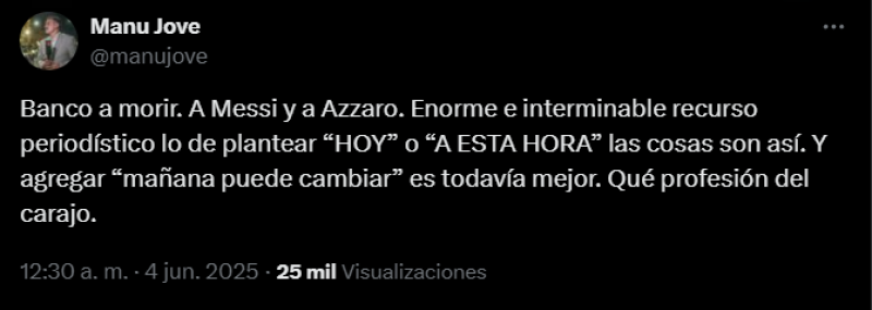"Banco a morir. A Messi y a Azzaro. Enorme e interminable recurso periodístico lo de plantear “HOY” o “A ESTA HORA” las cosas son así. Y agregar “mañana puede cambiar” es todavía mejor. Qué profesión del carajo", comentó Jove.