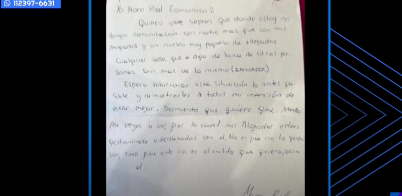 En tanto, le pasó a la producción del programa un comunicado de More Rial: "Quiero que sepan que, donde estoy, no tengo comunicación con nadie más que con mis abogados. Cualquier cosa que se digan son más de lo mismo. Muestro mi intención de estar mejor".