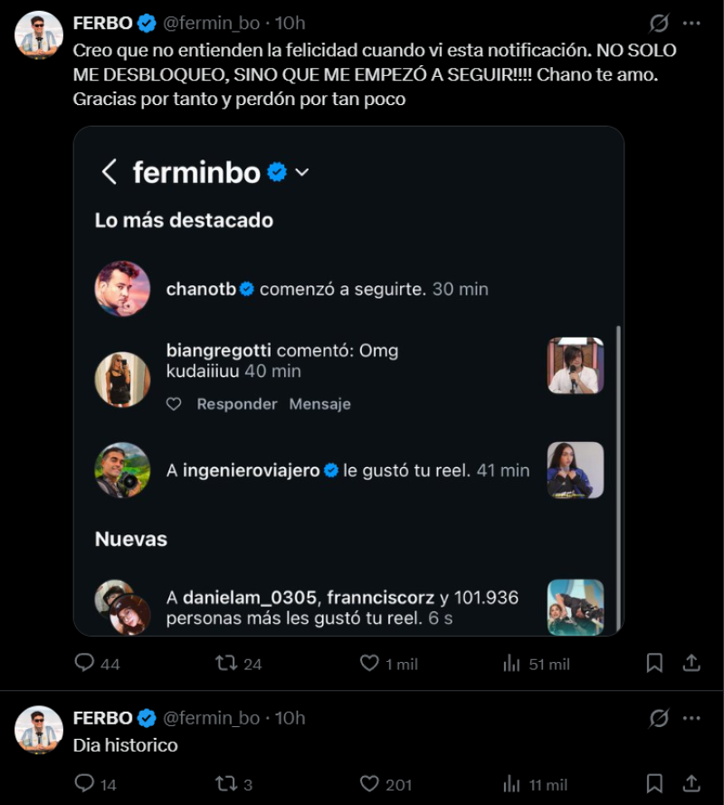 Finalmente, en su cuenta de X, Ferbo no aguantó la ansiedad. Lo iba a comunicar en Luzu, pero lo hizo en sus redes... ¡CHANO LO DESBLOQUEÓ! Y, encima, empezó a seguirlo. Esto generó la emoción del conductor, quien resumió: "Histórico". ¡Lo decretó, y se cumplió! La famosa ley de atracción, en tiempo récord.