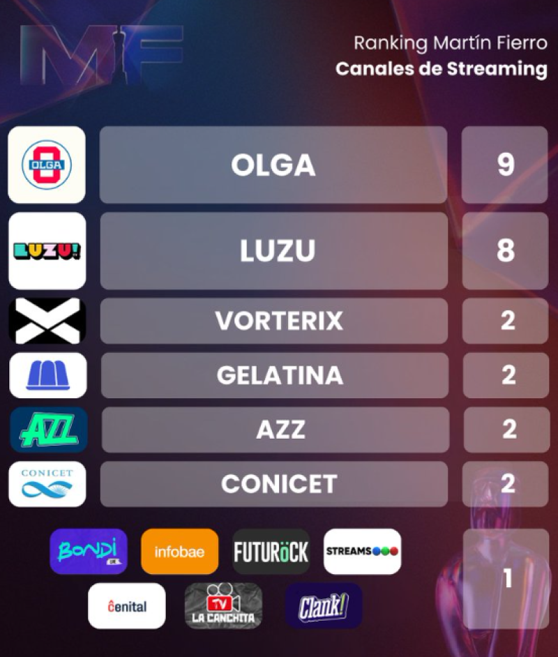Al finalizar la noche, el conteo dejó a Olga y Luzu como los medios con más galardones, aunque uno superó al otro por sólo una premiación.
