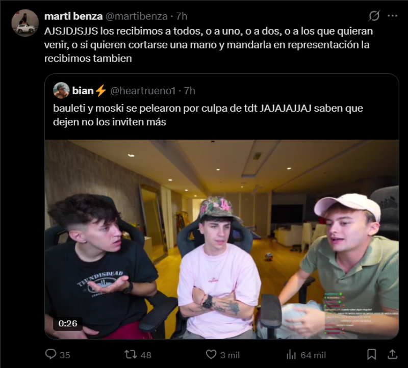 bauleti y moski se pelearon por culpa de tdt JAJAJAJJAJ saben que dejen no los inviten más pic.twitter.com/5GLIdC0gud