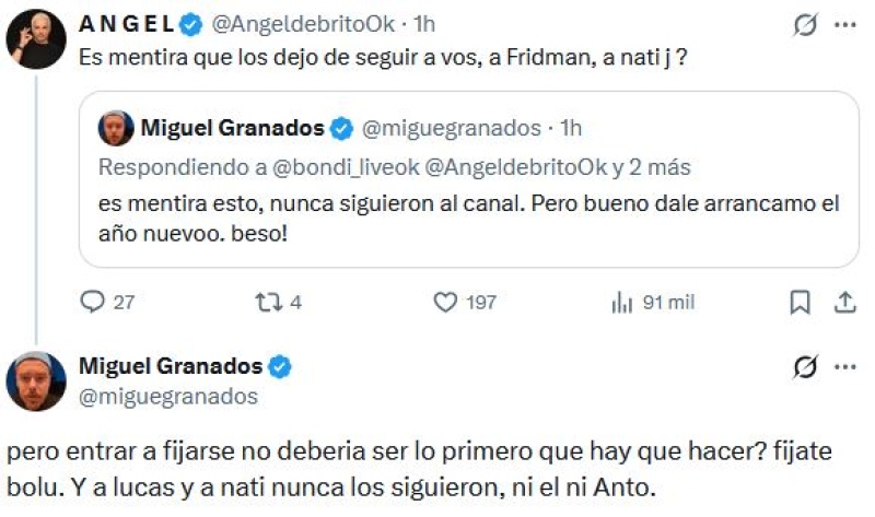 No es la primera vez que tienen diferencias. En 2025 Ángel criticó a Granados por "llevarse figuras de otros canales". Hace poco, se pelearon vía X, donde Migue reaccionó enojado por las declaraciones de De Brito.